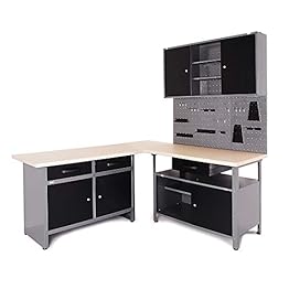 Ondis24 Werkstatt Ecklösung Basic One, 180 cm breit, Holzarbeitsplatte, 2x Werkbank, 1x Werkzeugschrank, Stahl…
