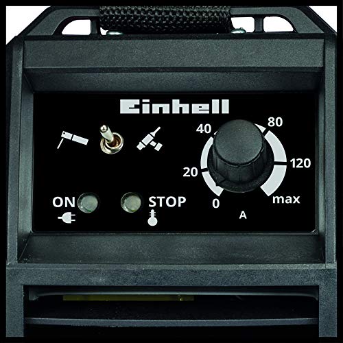 Das Einhell Inverter-Schweißgerät TC-IW 150 ermöglicht exaktes und sauberes Lichtbogenschweißen bei hoher Leistungsfähigkeit. Stufenlos regelbarer Schweißstrom lässt so die Arbeitsweise an jede Situation anpassen. Dabei sind auch längere Arbeitsgänge problemlos möglich: Die Ventilatorkühlung hält das Inverter-Schweißgerät auch bei höherer Belastung einsatzbereit. Der Thermowächter mit Kontrollleuchte schützt das Einhell Inverter-Schweißgerät TC-IW 150 überdies vor Überhitzung. Der Leistungsumfang beträgt beim Schweißstrom 20 bis 130 Ampere, für das WIG-Schweißen ist ein Leistungsbereich von 30 bis 150 Ampere möglich. Der Elektrodendurchmesser beträgt 1,6 bis 3,2 Millimeter. Dank des Umschalters für Elektroden- oder WIG-Schweißen ist das Gerät mit einem separat erhältlichen WIG-Brenner auch für das Schutzgasschweißen verwendbar. Das Inverter-Schweißgerät ist mit einer Masseklemme und einem Elektrodenhalter ausgestattet, welche mit Schnellkupplung verbunden werden können. Das robuste Stahlblechgehäuse ermöglicht einen mobilen Einsatz, es ist eigens dafür mit einem Tragegurt ausgestattet.